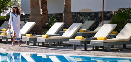 The hotel features an intimate gourmet restaurant in Santorini near Kamari beach and a casual open air restaurant by the pool. The Lydia restaurant in Santorini Island offers a delightful American buffet breakfast each morning on the sheltered veranda or under the shadow of its summer tents. Guests can enjoy scrumptious lunch meals and romantic candle light dinners at this cozy dinner restaurant by the pool or sip on a cocktail at the pool bar.
