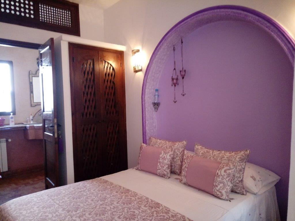 Room Lilac - double room with king size bed. The decór of this room is simple, comfortable and pleasant. The window overlooks a small, quiet street, in the heart of the Medina.