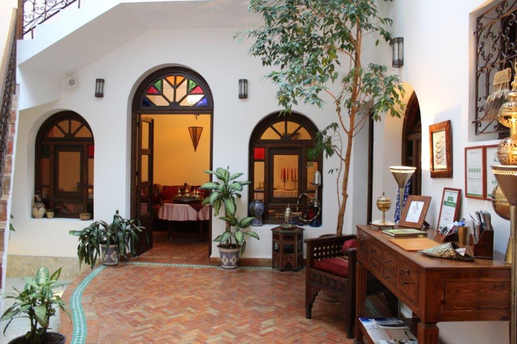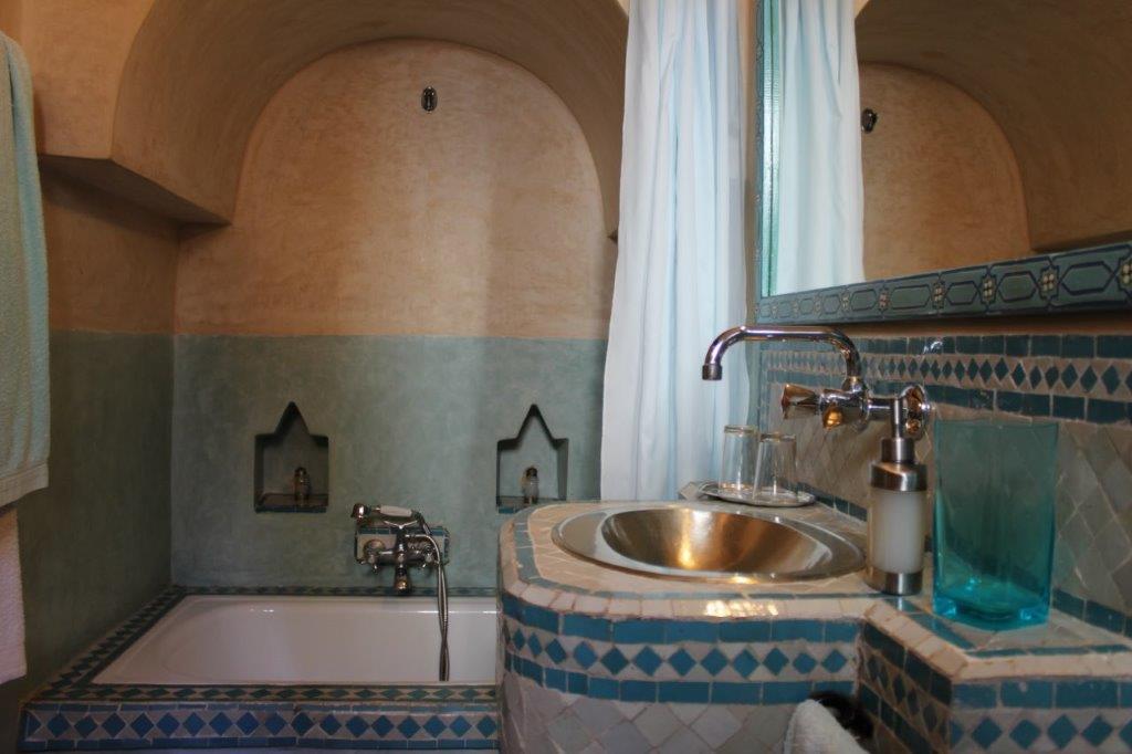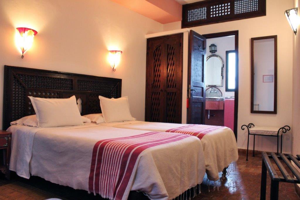 Room Rose - a large room with twin beds and a “chaise-long” sofa that can be used as an extra bed. The window, overlooking the courtyard, is a typical Moroccan arch from where you can see the patio fountain.