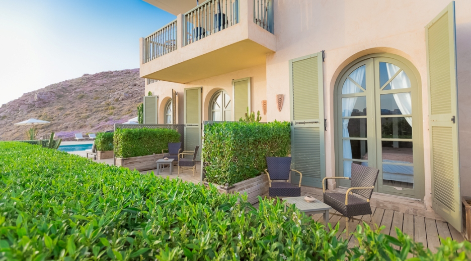 The Main House houses four double rooms with sea view and one larger room (suitable for 2 adults and 2 children) with rear view, all on the ground floor and with easy access to the pool and garden. On the first floor, there is a restaurant and bar, with outside terrace overlooking the sea, where you can have drinks or dinner.