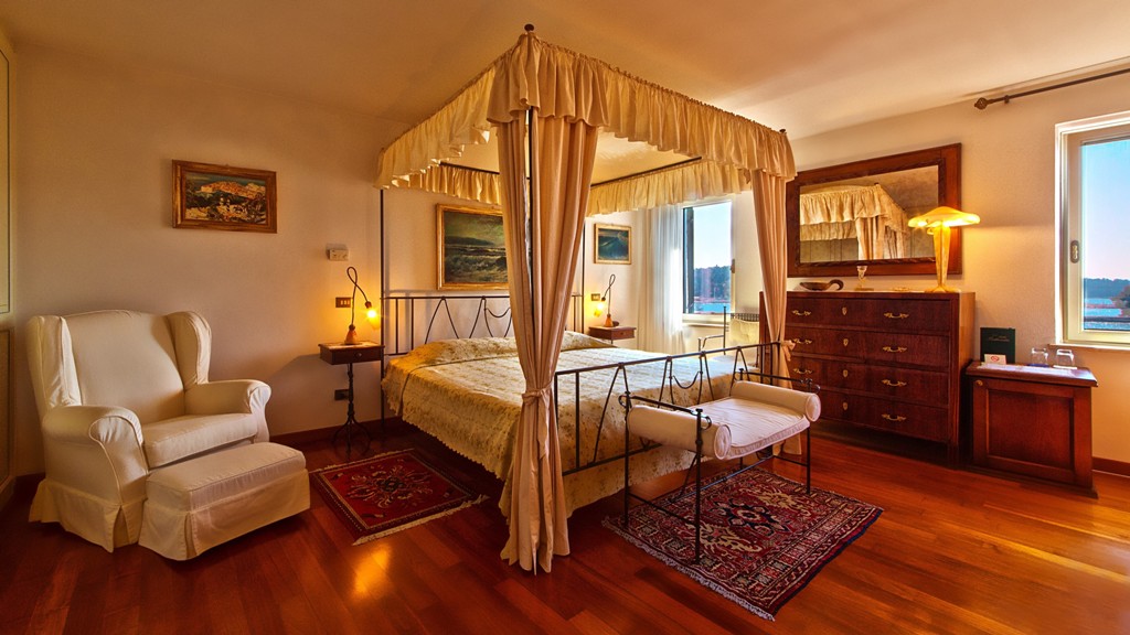 Villa Tuttorotto has only a handful of rooms: 4 doubles (these rooms can be made into twin rooms upon request), 2 singles and a superior suite.  The rooms can be rented in a variety of combinations - including reserving an entire floor, with a balcony, fabulous terrace and a lounge with a period fireplace. Each room has a beautiful view of the port and of the pine woods that cover the nearby island of St. Catherine and the peninsula of Punta Corrente. The individually designed rooms are centrally air conditioned and each room is equipped with a minibar, safe, flat screen satellite TV, wireless internet access and, above all… a breathtaking view!