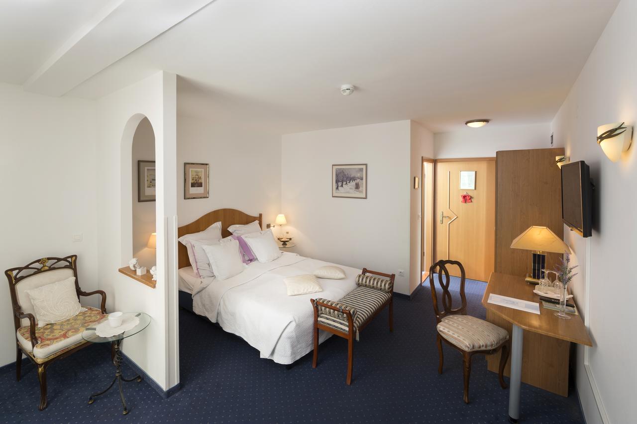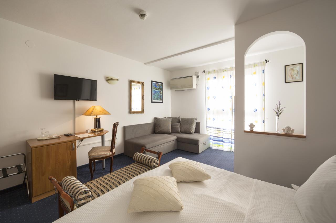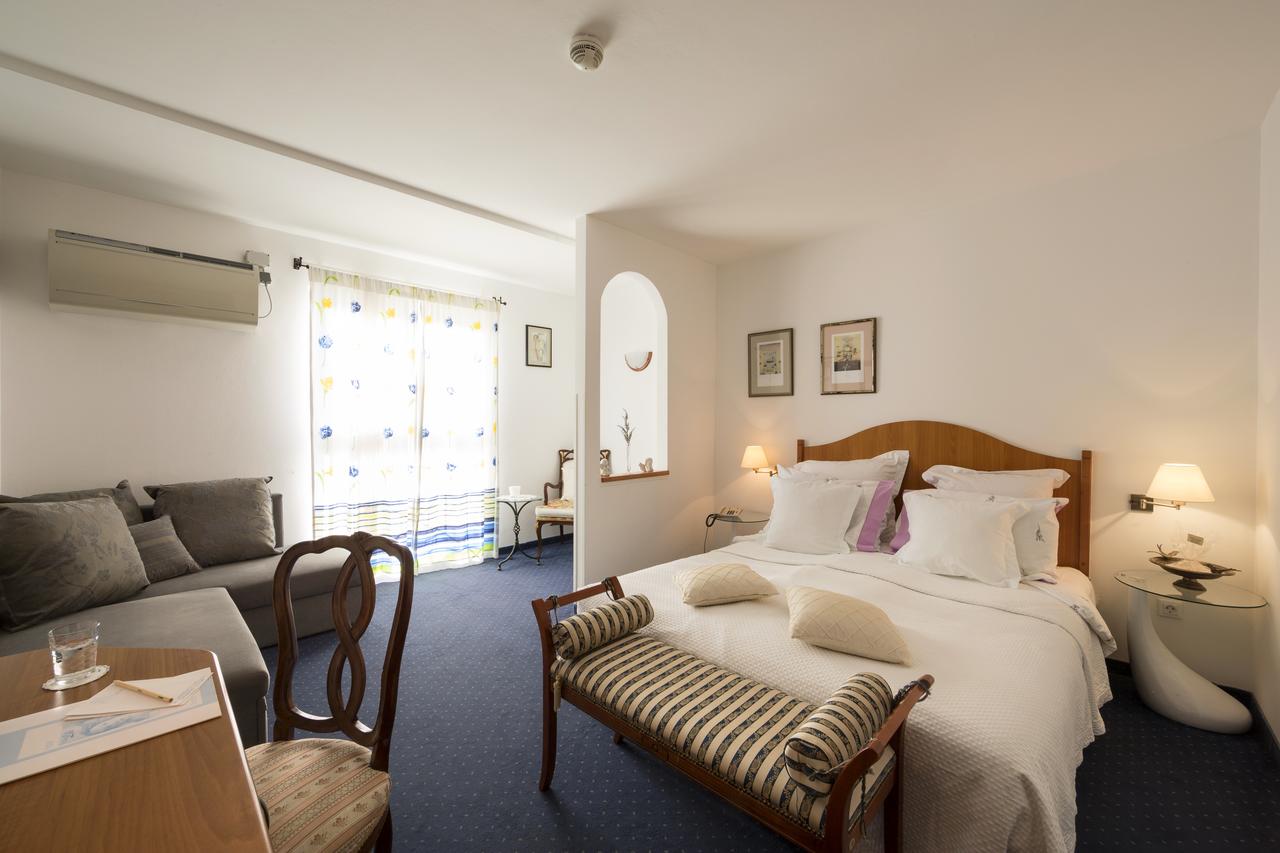 The hotel has 17 rooms and 3 suites. All rooms have air-conditioning, satellite TV, mini-bar, direct telephone line, internet connection, safe, heating, anti-allergy pillows, fire alarm, bathroom with shower, hairdryer, cosmetic mirror; suites have 2 satellite TVs and dual air-conditioners. Junior suites & suites can sleep 2 adults and 2 children (on a sofa bed). There are actually two separate rooms in the suite.