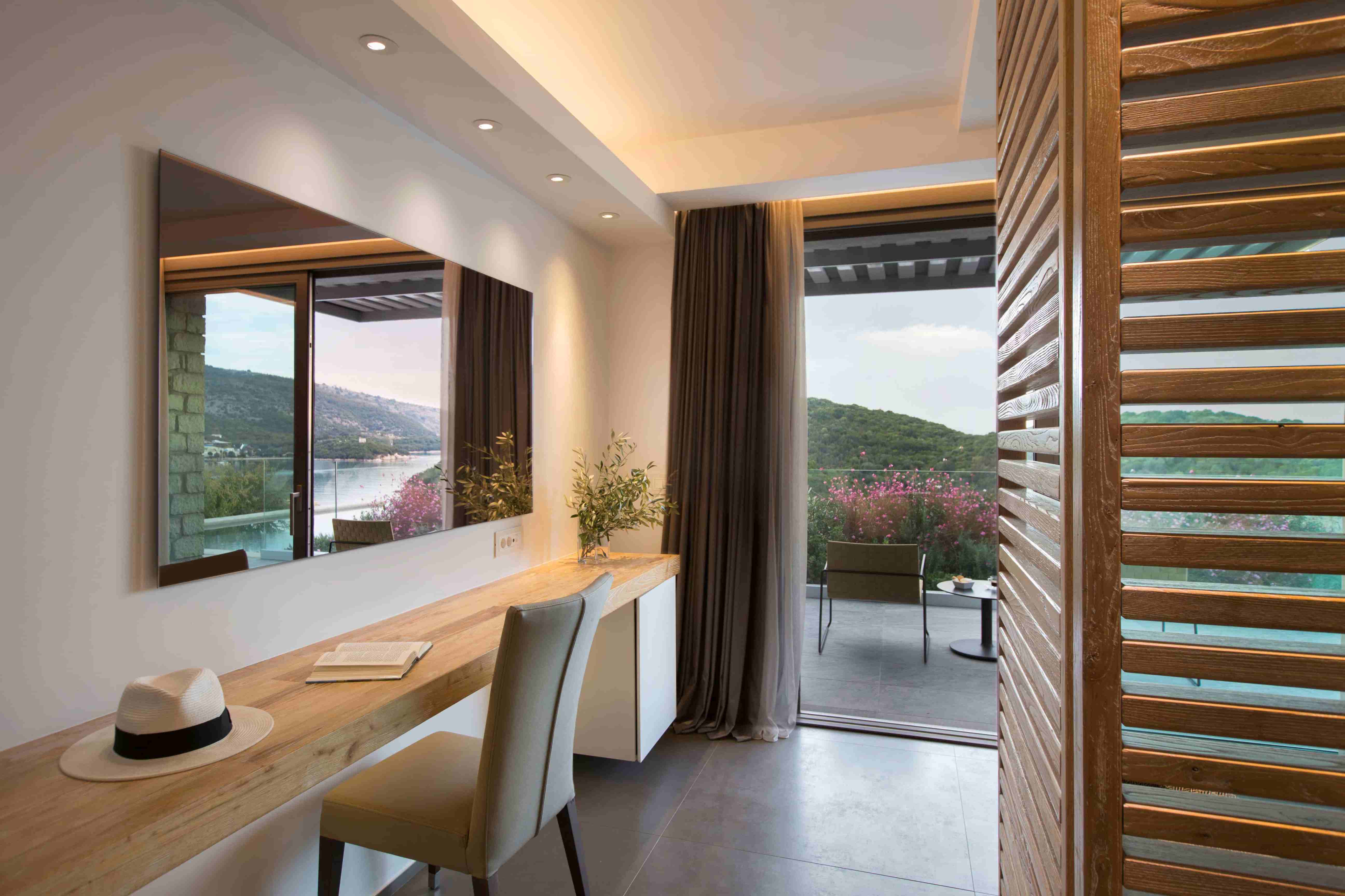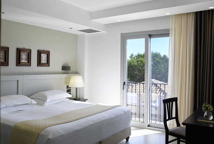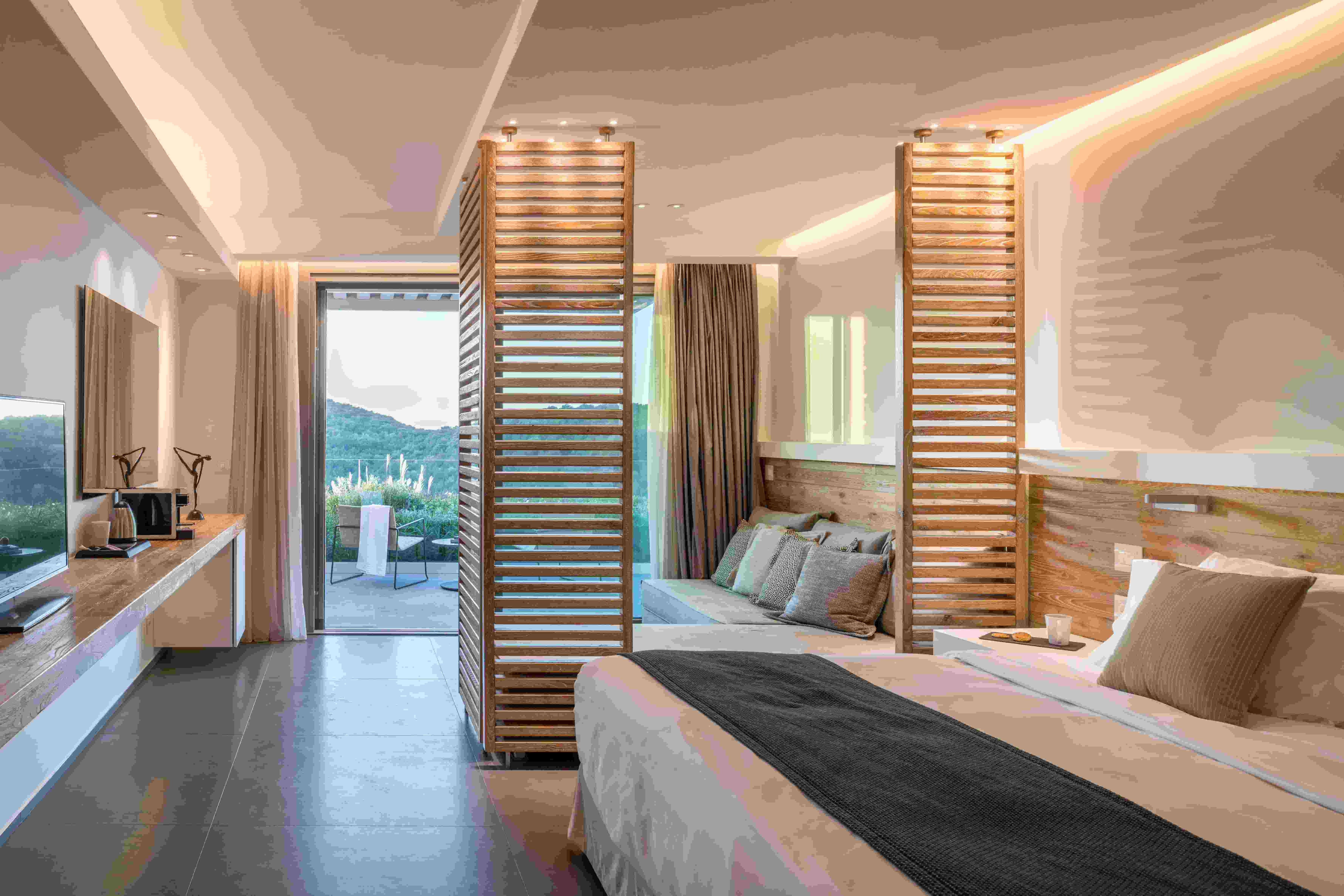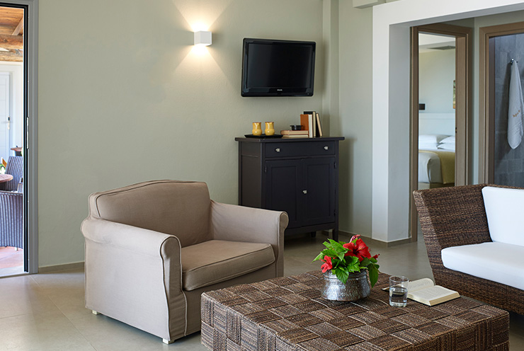 • Junior Suite (36sqm) stone- built, open plan suites with wooden separators, with a balcony or terrace. All suites enjoy a direct sea view and have either a  double bed or twin beds plus a corner sofa. Maximum occupancy is 3 adults or 2 adults and a child (up to 10 years old)