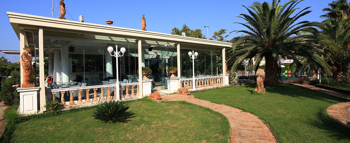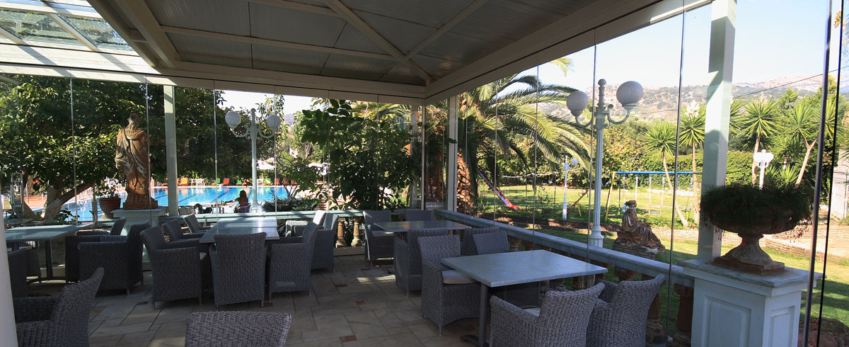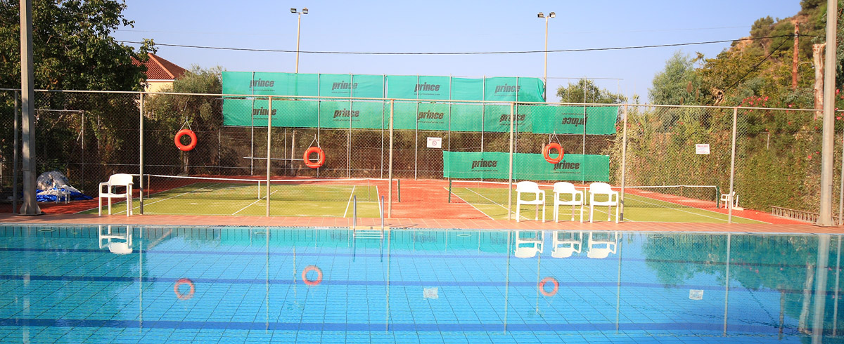 Reception; open-air restaurant; garden; playground; bar; swimming pool; tennis courts.